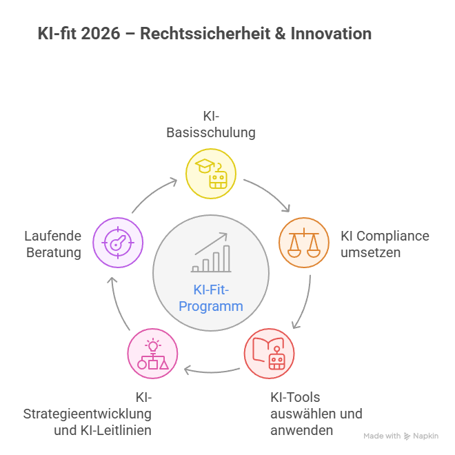 Zur Umsetzung der KI-Verordnung (mit Schulungs- und Transparenzpflichten ab 2025) und aufgrund zahlreicher Anfragen bieten wir das von über 100 Organisationen genutzte „KI fit – Beratungs- und Schulungspaket“ für Unternehmen, Verbände und Vereine auch 2026 an. Es unterstützt die praxisnahe Umsetzung der KI-Verordnung, hilft KI effektiv einzusetzen, KI-Kosten zu optimieren und KI-Leitlinien/Strategie für die Zukunft zu entwickeln